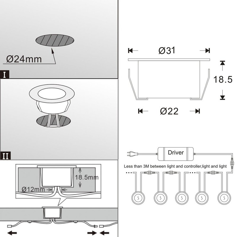 - Light Dimension -- Light Size: Φ1.22" x H0.73". Mount Hole Size: Φ0.94". Cable Length: 1.64ft (Per Light). Distance Between Light to Light: 3.28ft. All lights are certified to CE to ensure the product quality and safety. Our LED Deck lights are of the highest quality and an ideal product for transforming your home and garden.