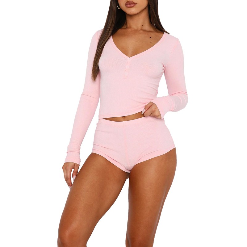 FWBBG Womens 2 Piece Pajama Sets Button Down Crop Tops Long Sleeve V Neck Matching With PJ Shorts Y2k Outfits Lounge Sleepwear Set (Short-Pink, Small)