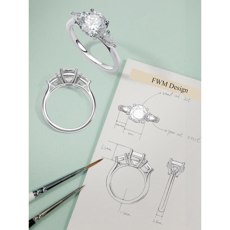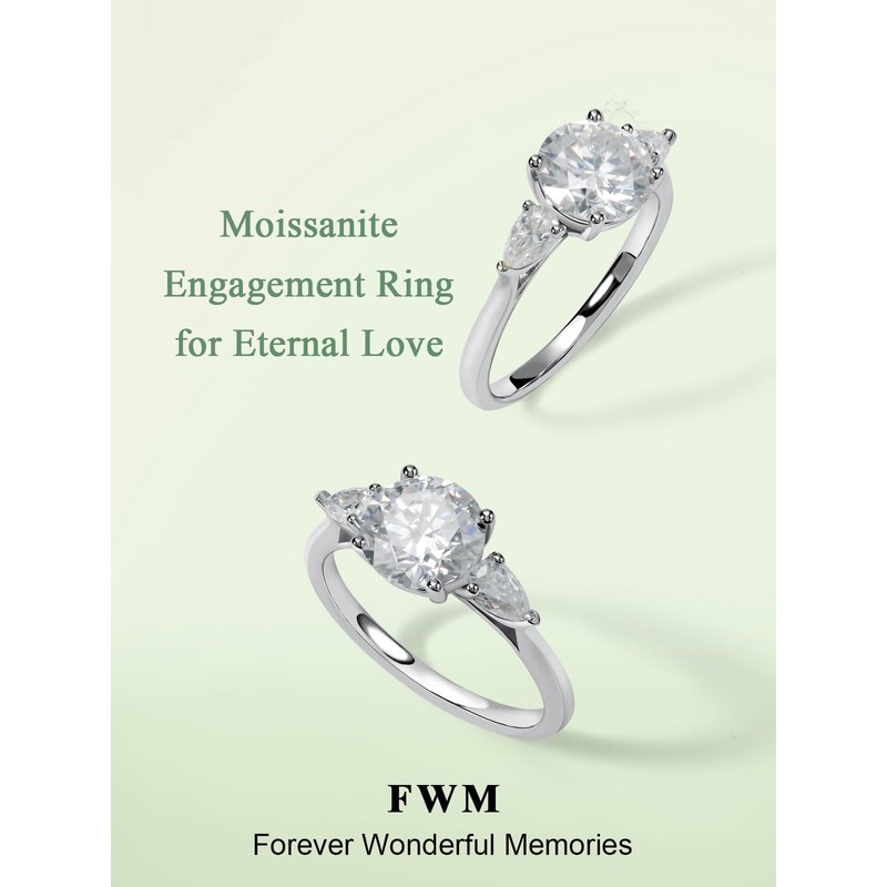 - 【100% Real Moissanite】- This 3 stone moissanite ring is topped with a 2.0 ct brilliant round cut moissanite and 2*0.35 ct pear cut sidestones, which is D color grade and VVS1 clarity, as well as its refractive index is twice that of diamonds, making it able to show more intense fire than diamonds when exposed to light, perfect for long term wear as well.
