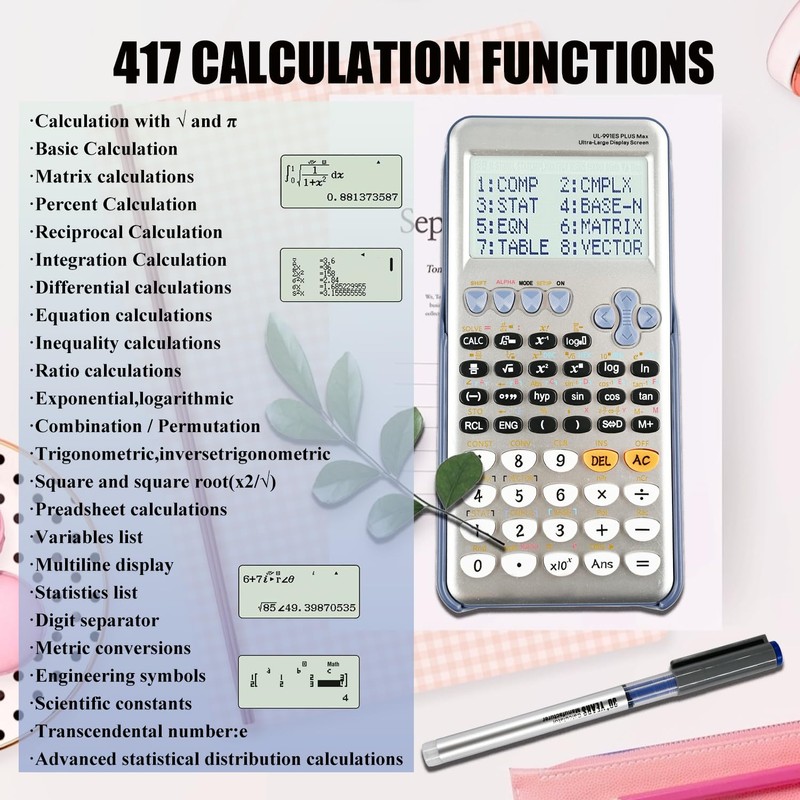 - 417 Calculation functions: This Scientific Calculators offers a wide range of functions, from basic arithmetic to advanced scientific calculations, including trigonometric functions, logarithms, and statistical functions, to meet all your mathematical needs.