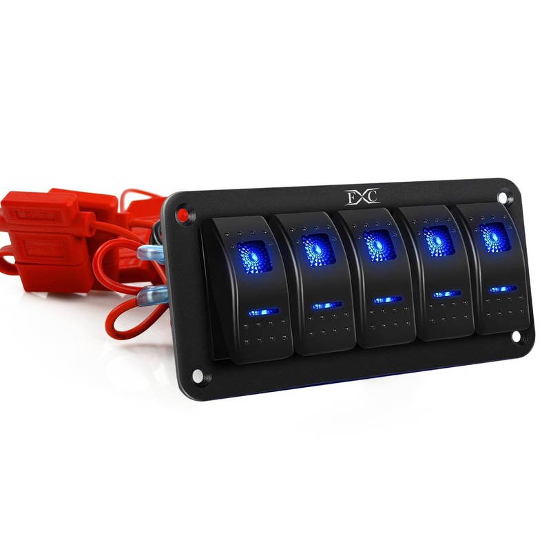 FXC Pre-Wired 5 Gang Rocker Switch Aluminum Panel with 40A Inline Fuse, Waterproof 6-Pin On-Off Car Boat Switch, Blue LED Switch Panel for Marine Boat Automotive RV Truck ATV Vehicles 12V/24V