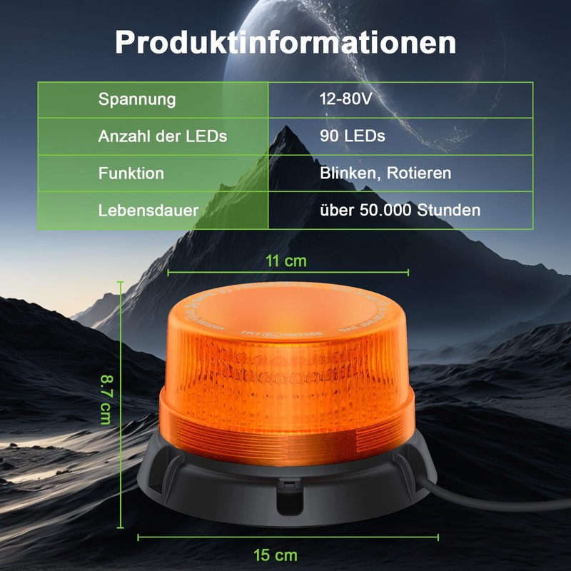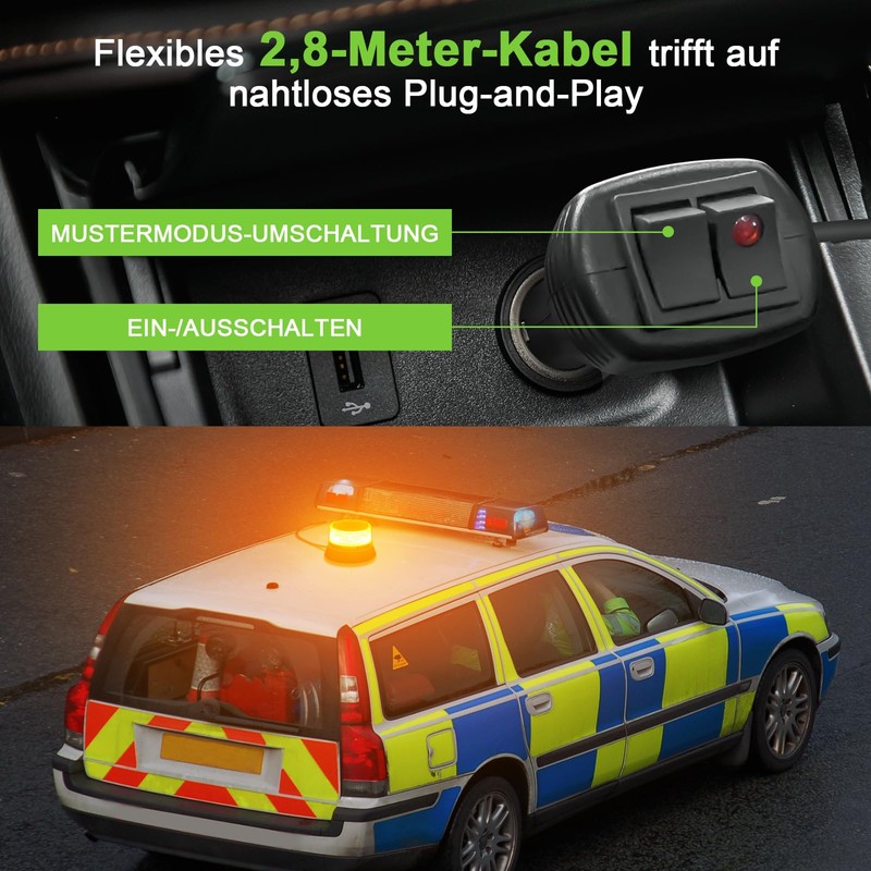 - Versatile rotating light mode and intense strobe mode: The special dual mode technology provides a rotating light mode as well as an intense strobe mode. Regardless of the lighting conditions, the rotating light mode provides even illumination of the environment, while the strobe mode attracts targeted attention and warns road users early. These options are controlled by simple switching and provide increased protection and improved visibility in emergencies, roadside work or construction sites, significantly reducing the likelihood of accidents.