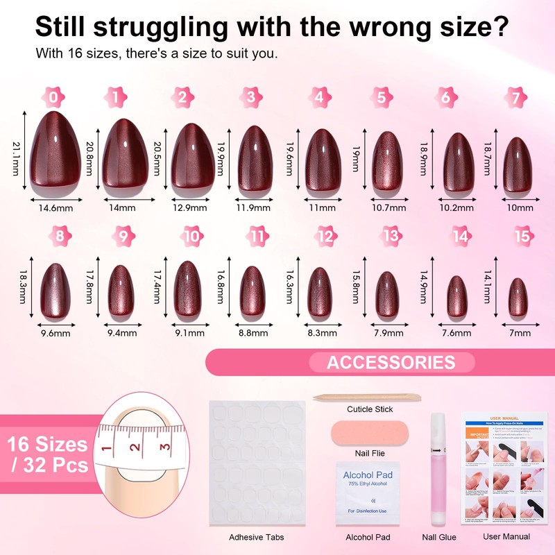 FYB Press On Nails, Short Almond Nails, Reusable, 15 Sizes - 30 Reusable Fake Nails Kit, With Glue (08-Dark Red Cat's Eye, 32 Piece Set)