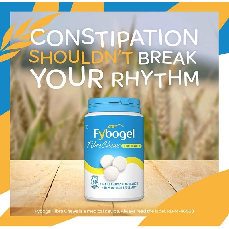 • WHY FYBOGEL? Fybogel Fibre Chews are tasty citrus flavoured chewable tablets that help to relieve constipation and maintain bowl regularity