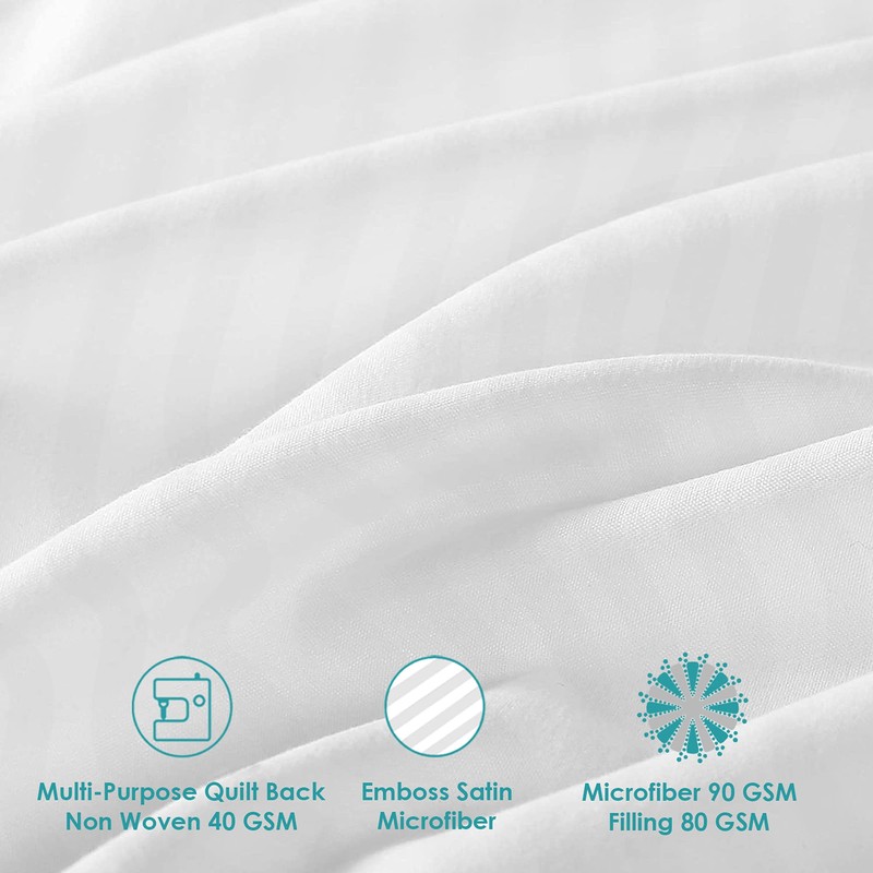 Experience a comfortable sleeping environment with our super soft Satin Pillow covers. SIZE AND COLOR Comes in a pack of 4 Available in aesthetically pleasant white shade that adds elegance and suitable for all bedding styles Aptly measured to size 50x75cm, provides perfect fitting and prevents your comfy pillows sliding out STATE OF THE ART MATERIAL Each pillow case features the benefit of 90gsm Micro fiber Emboss Satin Material Beautiful and Delicate finishing ensures style making focal points Highly durable and less prone to accidental rips Devoid from irritants that ensures safety and luxurious comfort Premium quality material that does not fade away or get wrinkled after frequent use MODERN DESIGN Tightly woven fabric that ensures longevity and smooth finish Deep envelope closure design lets you put in and out your comfy pillows easily Perfect to give strong grip to the pillows Lightweight and soft to touch Comfortability Aiming to solve all your sleeping problems, With the high-quality materials, we promise to provide you a cushioning cozy sleeping experience. Turn a boring bed into a soft pillow top, so you would never be worried about waking up uncomfortable at all. Remains dry and cool, Our satin pillowcases are a luxury to be enjoyed throughout the year. Ultra soft Material can cover and protect the pillows from being dirty and also can decorate your bedroom. Made of Microfiber with Embossed satin Stripes offer long-lasting strength and smooth finish and exceptional longevity. 4 Pack pillowcase, you can change your pillowcase much more frequently. These pillowcases are awesome for sweeping, also great to use at sleepovers EASY TO WASH Sturdy and resilient, prevent stains Can be easily machine washed at 40 degree Celsius temperature Tumble dry on gentle cycle Product Specification ●Package Includes: 4 Pillow Covers ●Package Weight: 500grams ●Package Size: 28cmx22cmx2.5cm ●Product size: 50cmx75cm (each) ●Color: White ●Material: Micro fiber Emboss