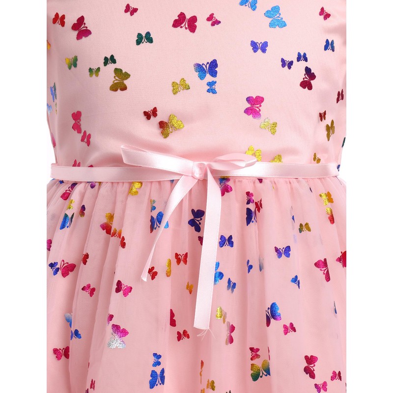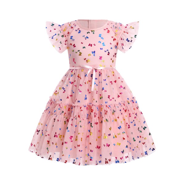 FYMNSI Kids Girls Flower Girl Dress Toddler Princess Reflective Butterfly Ruffle Mesh Layered Tulle Tutu Summer Causal Formal Dresses Birthday Party Christmas Pageant Wedding Ball Gowns Pink 6-7T