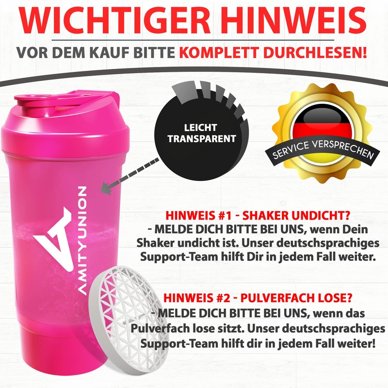 - Extra powder compartment plus strainer: the shaker comes with an additional 100 ml (60 g) powder compartment. Thanks to the additional, clickable sieve, there are now only lump-free shakes. Annoying stirring or long mixing is no longer necessary with our shaker. Enjoy your creamy protein shakes after just a few seconds shaking.
