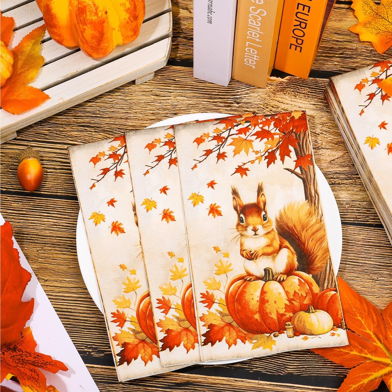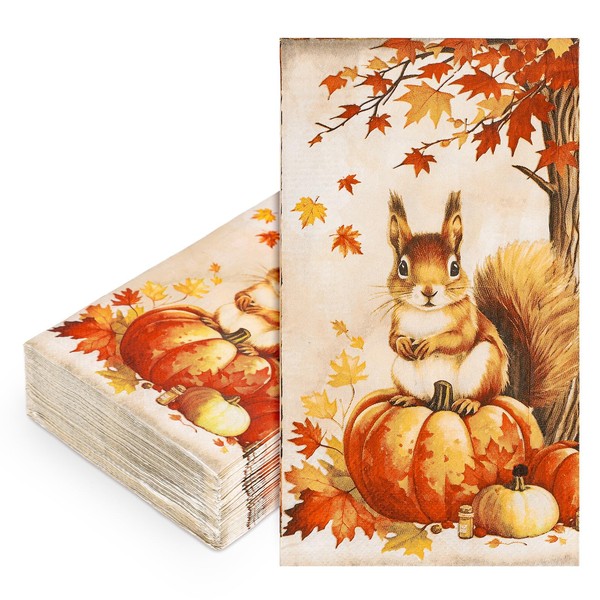 - FUNNY DESIGN: Our fall thanksgiving theme guest napkins are designed with pumpkin, squirrel, maple leaves and maple tree, in classic autumn colors, delicate and seasonal