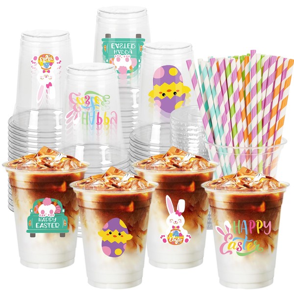 - EASTER DESIGN: Our party cups have 4 cute Easter designs, are printed with Easter egg, bunny, chick, truck, etc., and the straws are in stripe design with 4 holiday colors, lovely and attractive