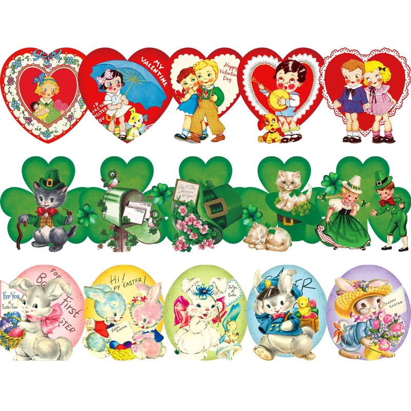 - RETRO DESIGN: Our holiday theme bulletin board borders are designed in shape of Valentine’s Day heart, St. Patrick’s Day shamrock and Easter egg, patterned with boys, girls, cats and bunny, vintage and festive