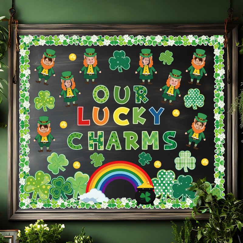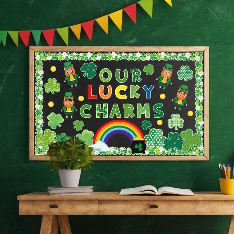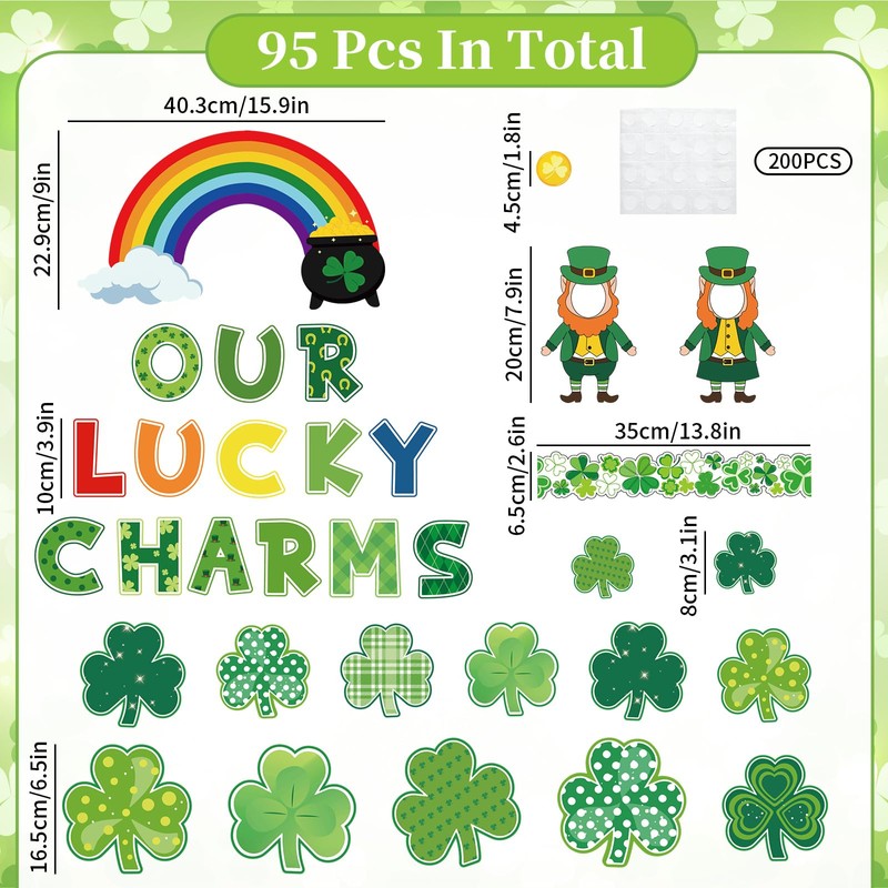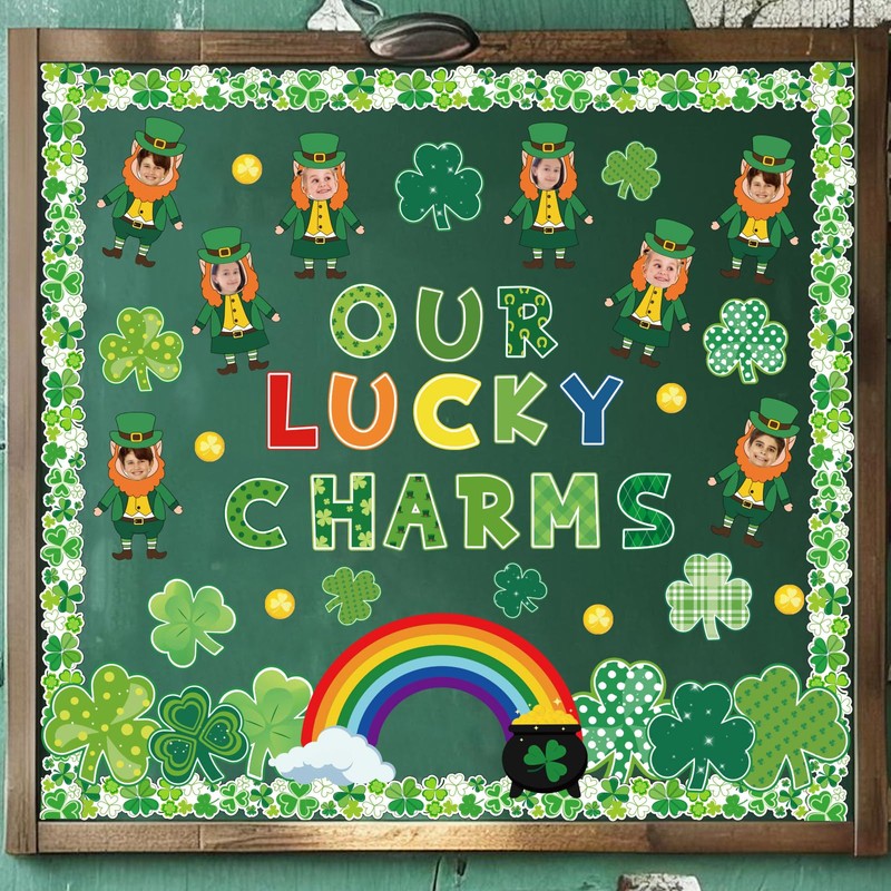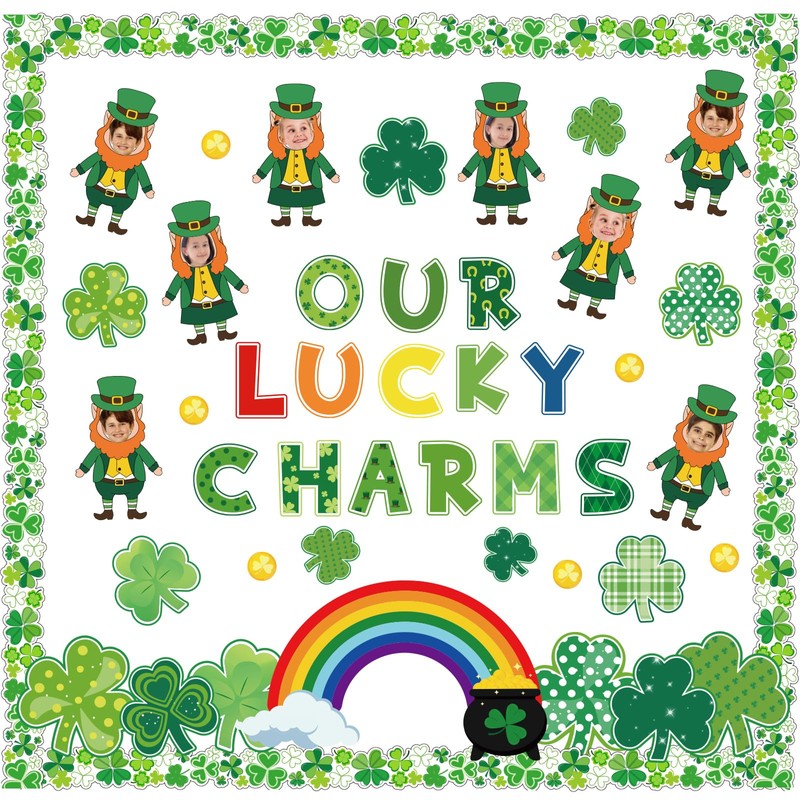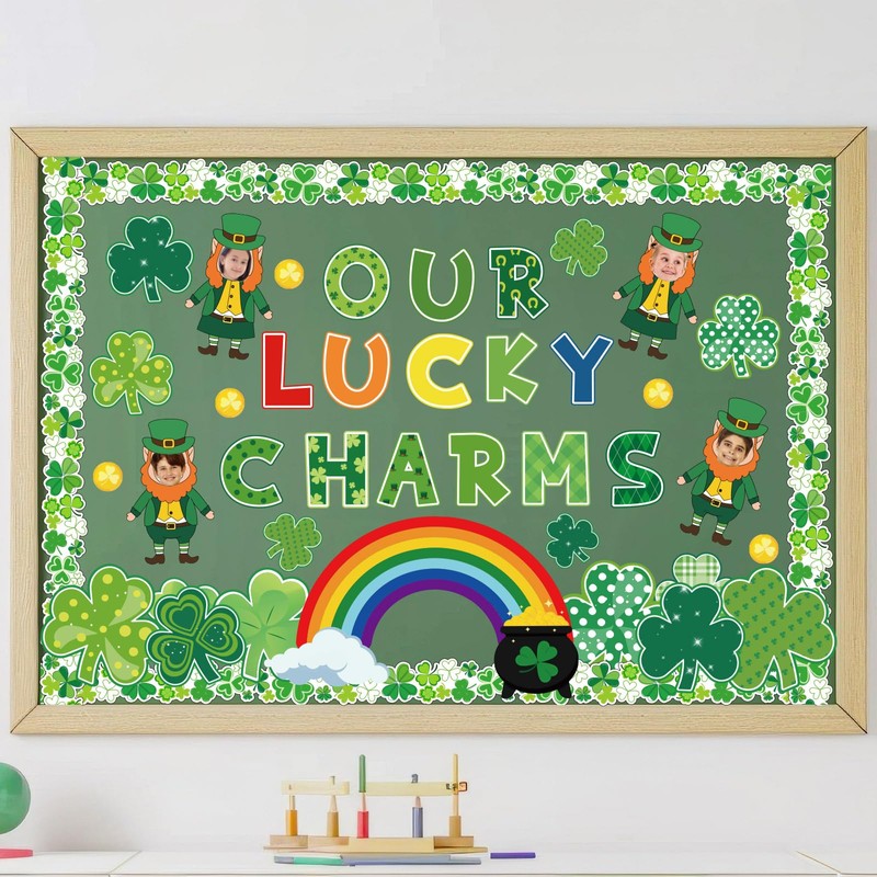 • FESTIVE DESIGN: The bulletin board decor features a theme of St. Patrick's Day with lucky clover, rainbow and pot of gold coin design, etc., printed with the words our lucky charms, adding a perfect addition to your holiday party