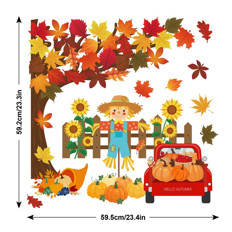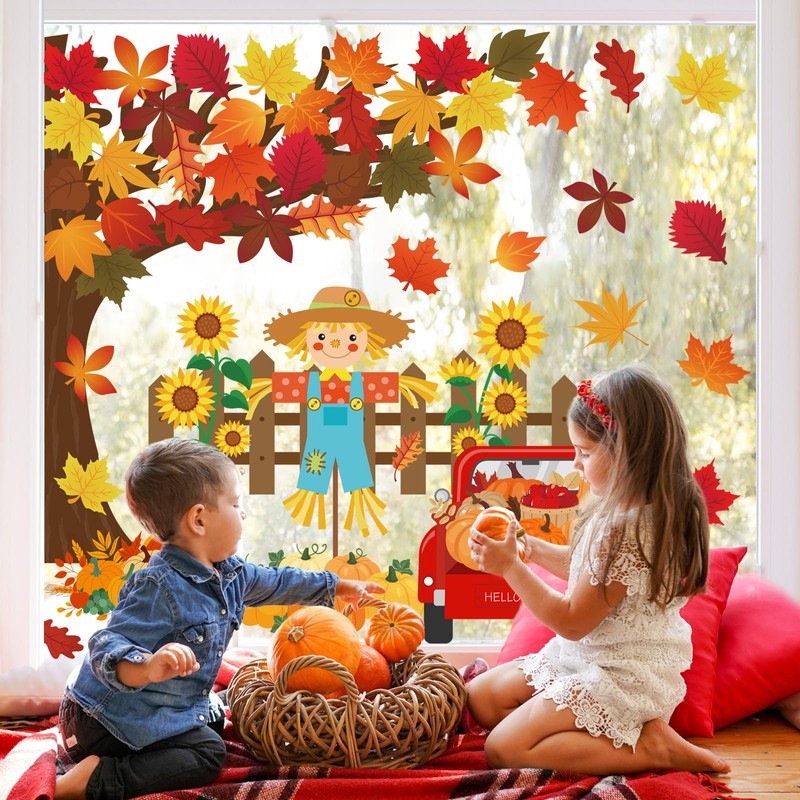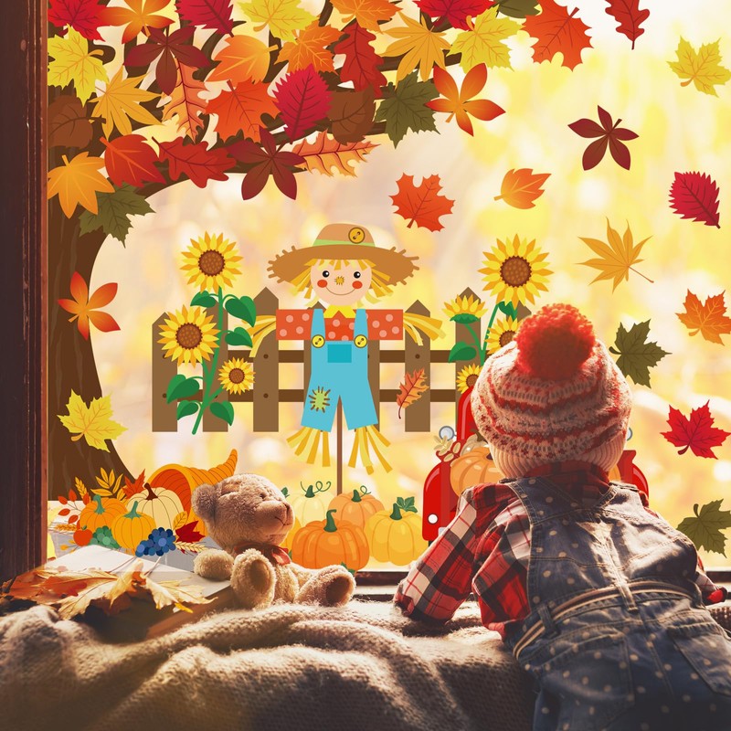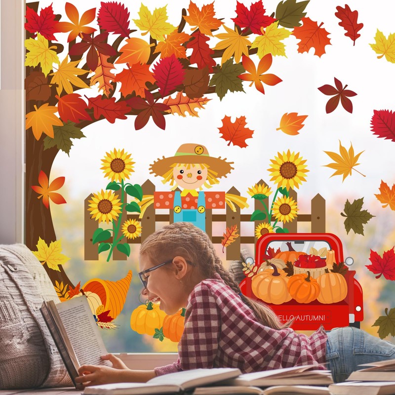 - CARTOON STYLES: Our fall theme window clings adopt cartoon design with tree, scarecrow, maple leaves, pumpkin truck and various relevant elements, funny and delicate, will nicely increase seasonal atmosphere