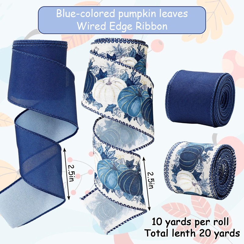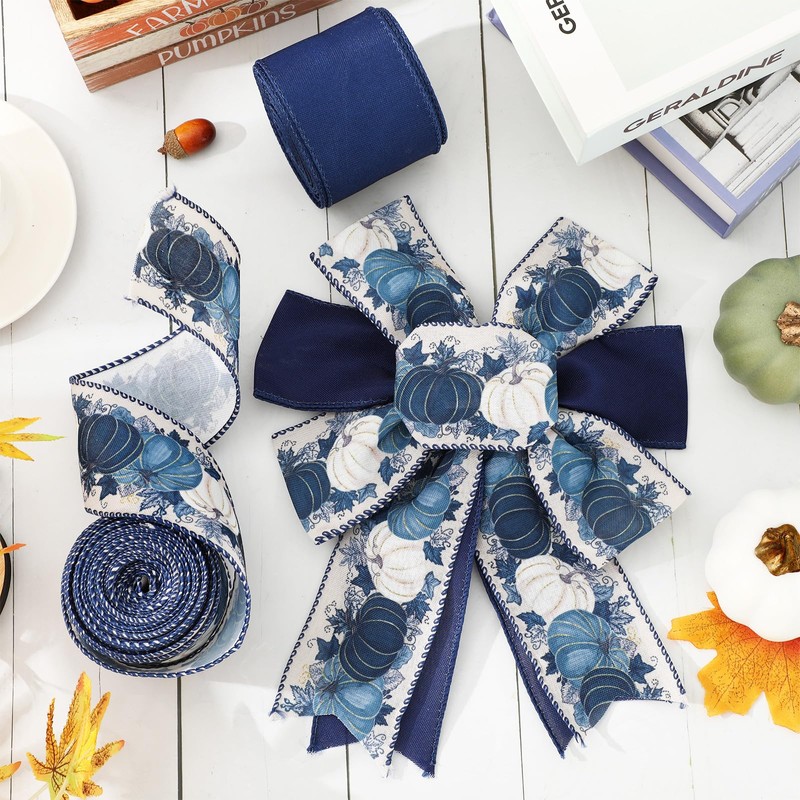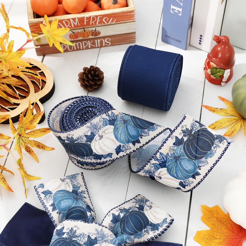 - ELEGANT DESIGN: One roll is patterned with white and blue pumpkins and maple leaves, the other is in solid dark blue color, rustic and elegant, great supplies for crafts making