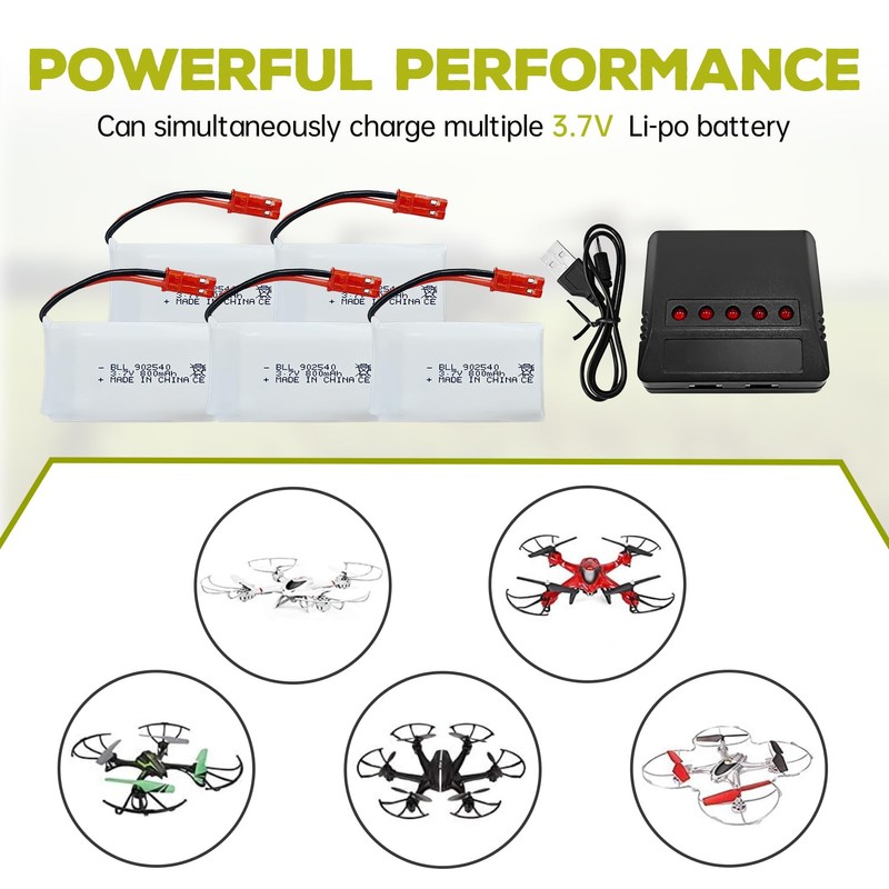 - Package included: 5PCS 3.7V 800mAh Lipo Battery with 5-in-1 Charger JST Plug