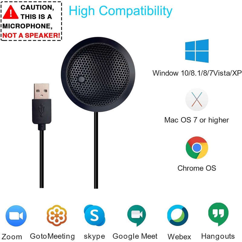 - 【2M USB Conference Microphone】 It is not a Speaker or Speakerphone, it is a 2 meters Omnidirectional condenser microphone. Capture sound from a 360-degree direction up to about 10 feets away, it can catch the voices of multiple people at the same time with extreme clarity.