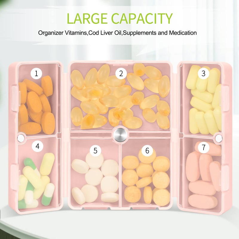 FYY Daily Pill Organiser, 7 Compartments Portable Pill Case Travel Pill Organizer,[Folding Design]Pill Box for Purse Pocket to Hold Vitamins,Cod Liver Oil,Supplements and Medication-Pink