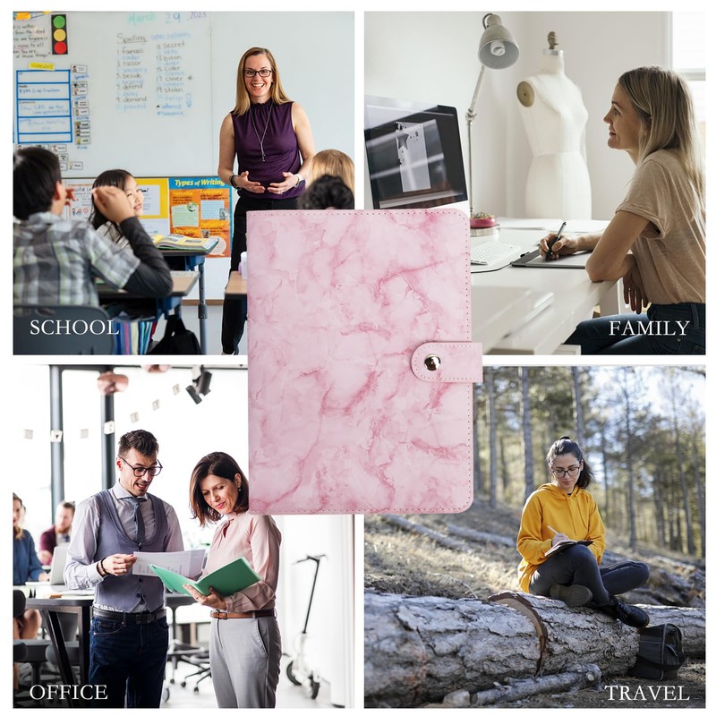 FYY Leather A5 Ring Binder Notebook - 6 Ring A5 Binder with A5 Refill Papers, Binder Pockets and PVC Sticky Notes, Travel Binder Journal Personal Planner with Ring Binder Marble-Pink