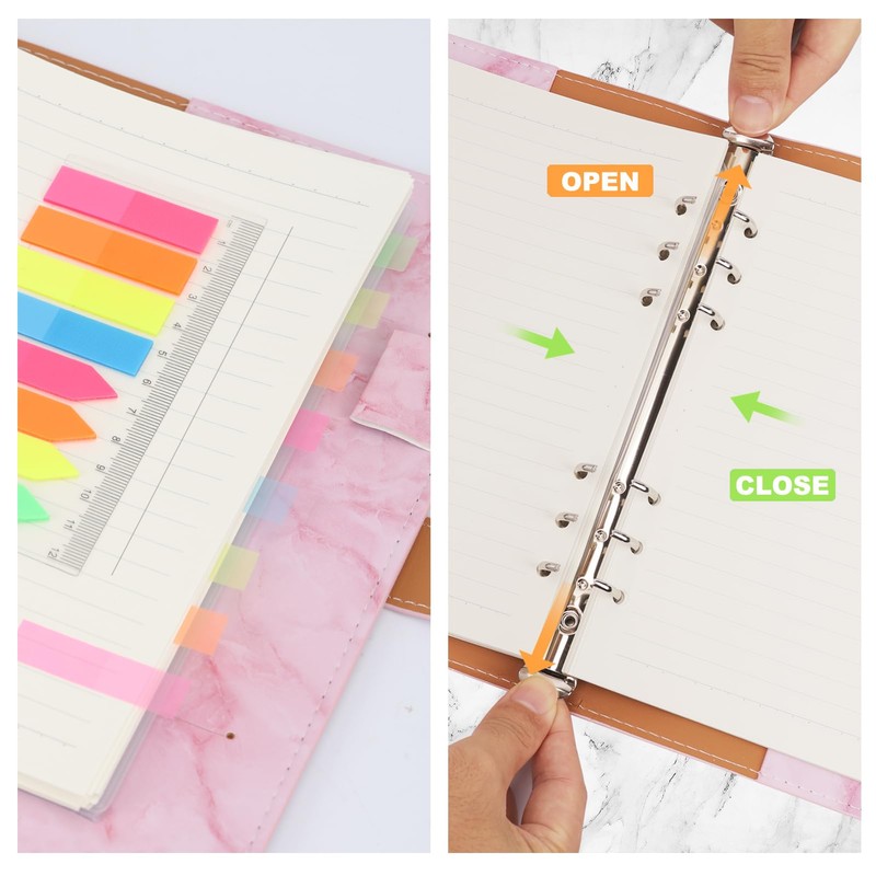 - đăPackage ContainăThe A5 binder set includes 1pcs 6-ring binder cover, 80 sheets of lined paper, 3pcs binder pockets with 3 styles, and 160pcs PVC sticky index flags. Your 100% satisfaction is our mission. If there is any problem about our items, please feel free to contact us in e-mail, we will provide money-back or replacement service.