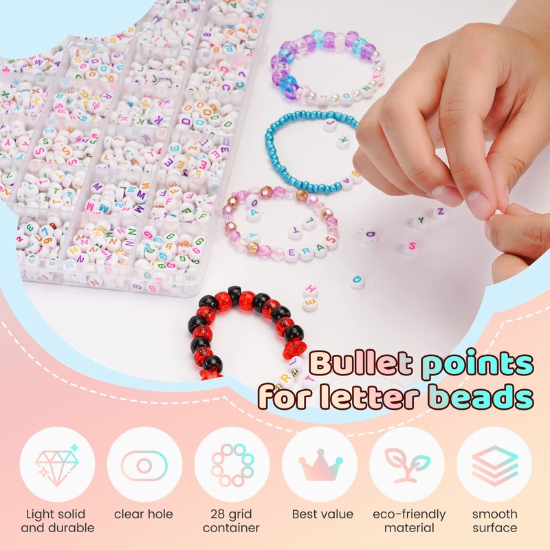 - Are you looking for a fun and creative way to make friendship bracelets? Then you have come to the right place with our DIY letter bead kit! You will receive a 28-grid box with 26 letters, heart beads and number beads. A total of 1450 beads, the letters "A E I O T" will be slightly more than other letters. and 1 roll of crystal thread (approx. 7 metres) and scissors