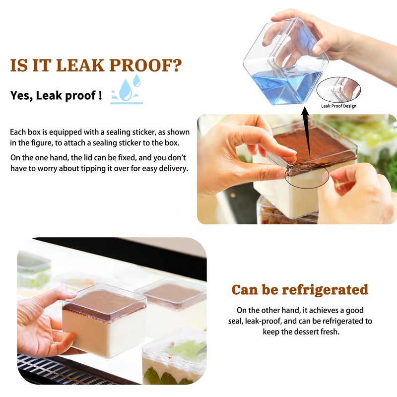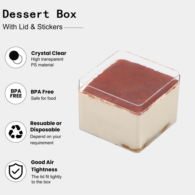 - Transparent plastic box size: 9.5*9.5*6.3 cm / 3.7*3.7*2.5 inches, 440ml, 15 oz. Great value for money: The package contains 16pcs transparent plastic dessert packaging boxes,16pcs sporks,16*3pcs Stickers.You can enjoy your baking time and save money, making the cake look more beautiful and delicious. It is very suitable for bakery shops and baking enthusiasts and daily use at home.