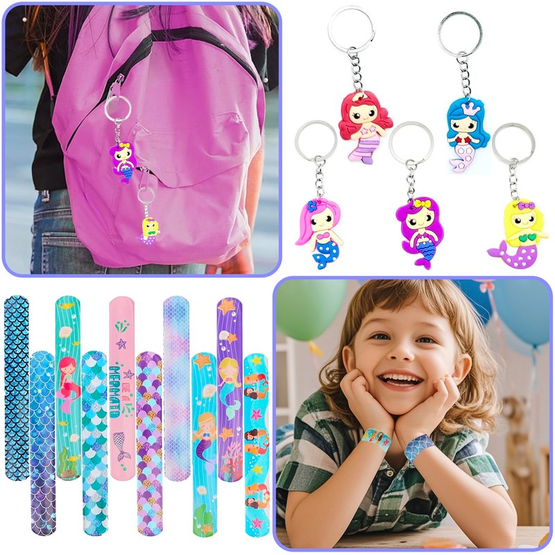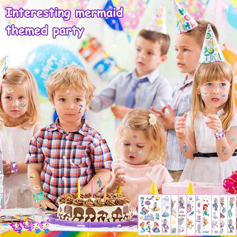 - Mermaid party bag children's birthday set: children's birthday party gifts are a versatile set for girls. Our mermaid souvenir children's birthday contains 10 snap bracelets, 10 mermaid tattoos, 10 mermaid key rings and 10 luminous silicone bracelets, which are ideal for children's birthday parties and craft activities. Mermaid birthday decoration is perfect for creative girls who love adventure in the sea