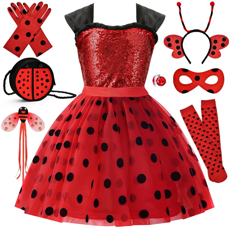 - 11pcs Lady Bug Costume Set: This lady bug costume for girls includes 11 adorable pieces, featuring a red and black polka dot dress, gloves, a cute bag, earrings, a headband, a mask, and knee-high socks. Every little girl can easily become her favorite character and enjoy the fun of role-playing as a charming lady bug, sparking her imagination and creativity. This set is perfect for both dress-up and everyday wear, allowing her to express her unique style