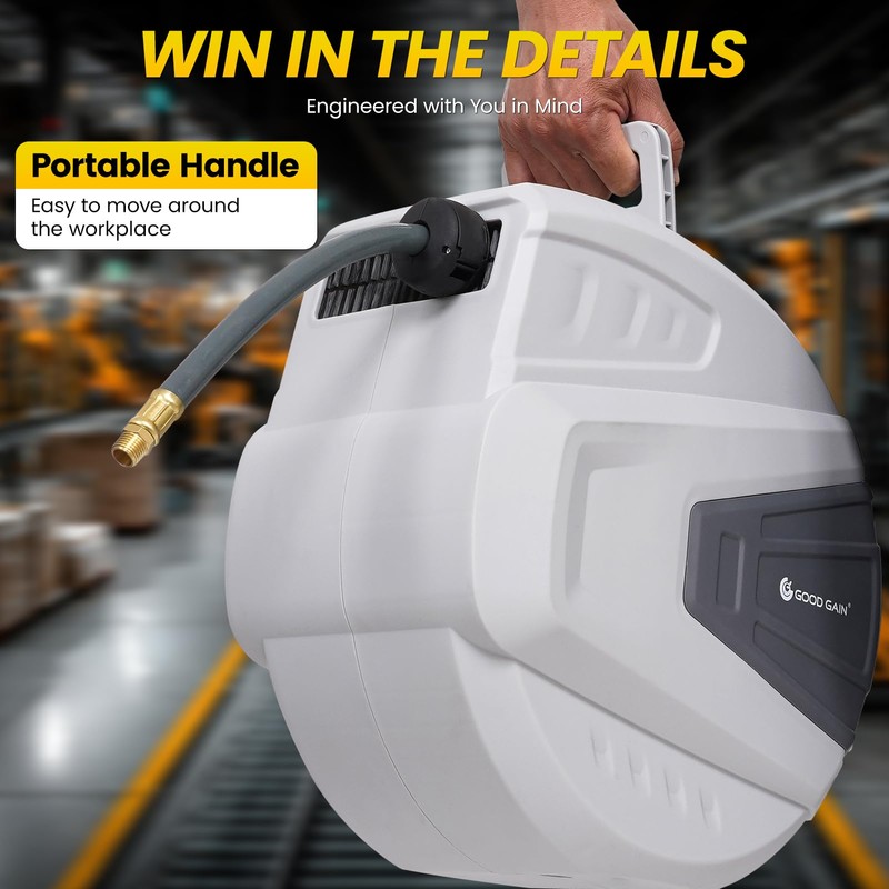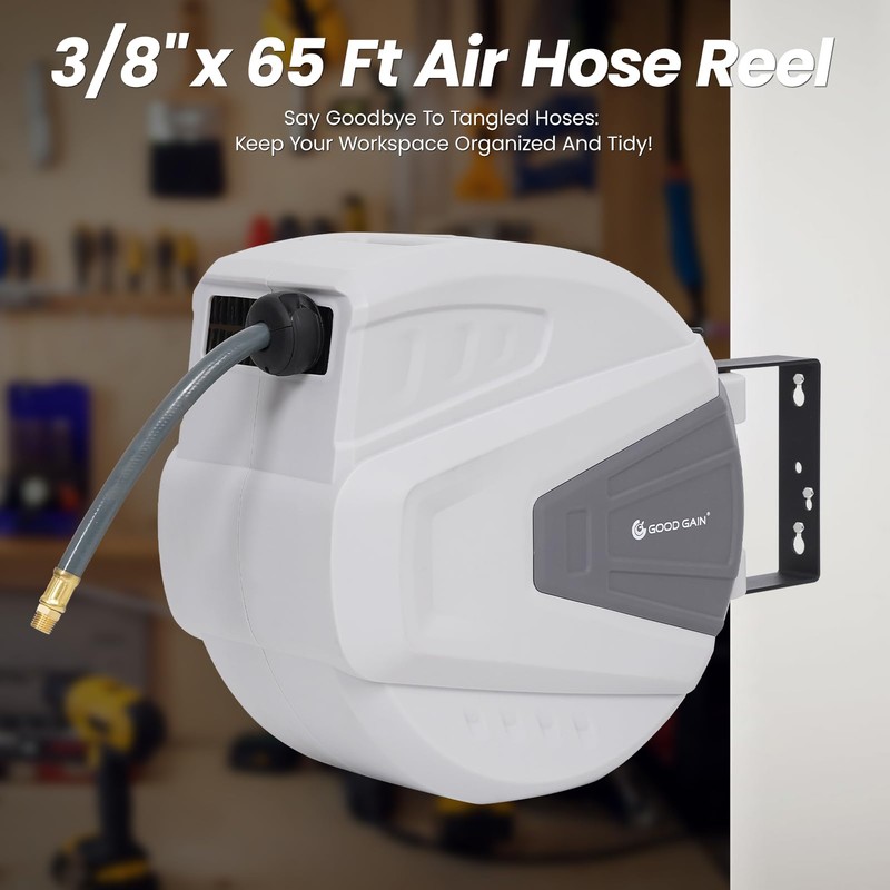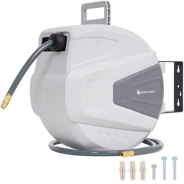 G GOOD GAIN Air Hose Reel Retractable 3/8 in x 65 ft Hybrid Polymer Hose, Air Compressor Hose Reel Retractable Auto-Rewind Enclosed 180° Swivel Mount, Max 300PSI Commerical Polypropylene Grey