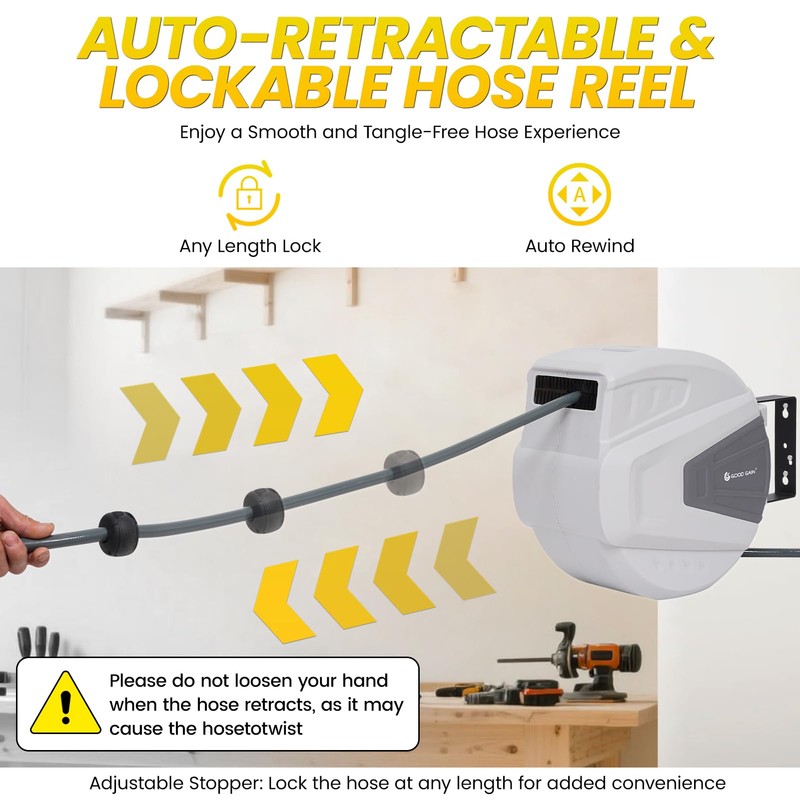 - Secure Locking & Leak-Proof Performance: The innovative free-lock mechanism allows the hose to stay firmly in place at any desired length, while a gentle tug automatically triggers smooth retraction. Featuring durable solid brass fittings (1/4-inch NPT) and a reliable quick-connect system, this unit ensures a tight, leak-free connection every time