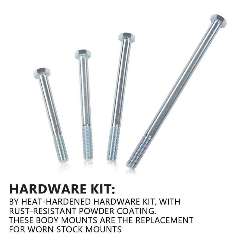 - Package Includes: 8 Body Mounts (M04060-02),8 Body Mounts (M04060-01),8 Small Steel Mounts (S22545),8 Large Steel Mounts (S22319),2 Body Mounts (M03306),2 Washers (S10126),and Hardware Kit (BP04057)