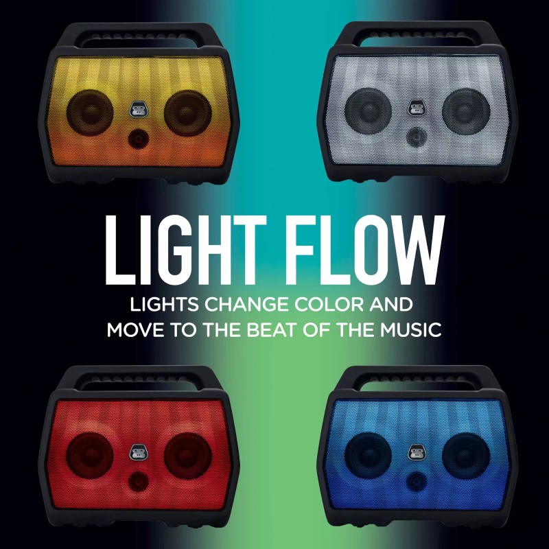 The original Bluetooth boombox just got better. Meet G-BOOM4 featuring Light Flow color changing light panel that moves to the music. G-BOOM4 is the ultimate Bluetooth speaker that pumps out big sound in a rugged, water-resistant, portable package. Sturdy enough to take on any adventure and loud enough for your neighbors to hear — whether they like it or not.