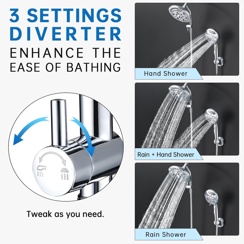 - 3-SETTING MODES FOR CHOICE: You you can easily switch between the handheld and rain shower head. You can also choose to use both shower heads simultaneously without a decrease in water pressure. Experience a renewed shower experience with this versatile diverter.