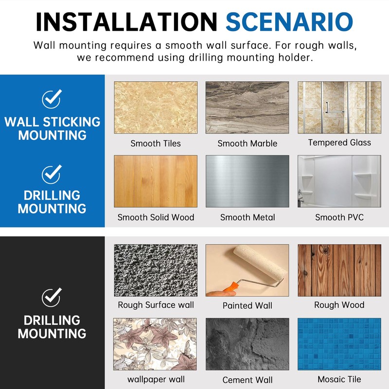 - DUAL PURPOSE HANDHELD SHOWER HEAD HOLDER: There are two uses for the handheld shower head holder, one for wall sticking mounting and one for drilling mounting. The wall sticking mount needs to be used on a smooth wall. For rough walls, we recommend using the drilling method of mounting the holder.