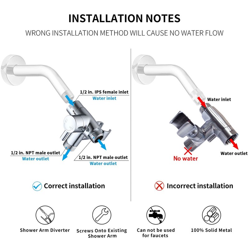 - ?One 1/2" IPS water inlet, two 1/2" NPT water outlet. Fits well with standard shower head and hose.
