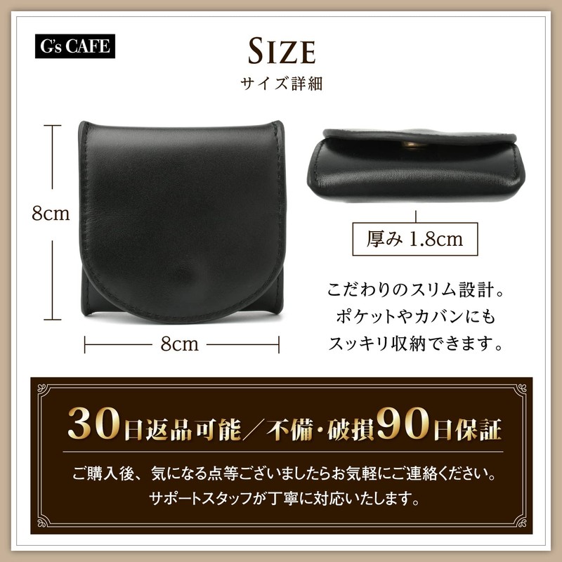 - Product Details: Brand Name: G's CAFE; Color: Black, Navy, Brown, Green, Off-White; Material: Cowhide leather (nappa leather); Size: Length 3.1 inches (8 cm) x Width 3.1 inches (8 cm) x Thickness 0.7 inches (1.8 cm); Uses: Coin purse, coin case, small item bag