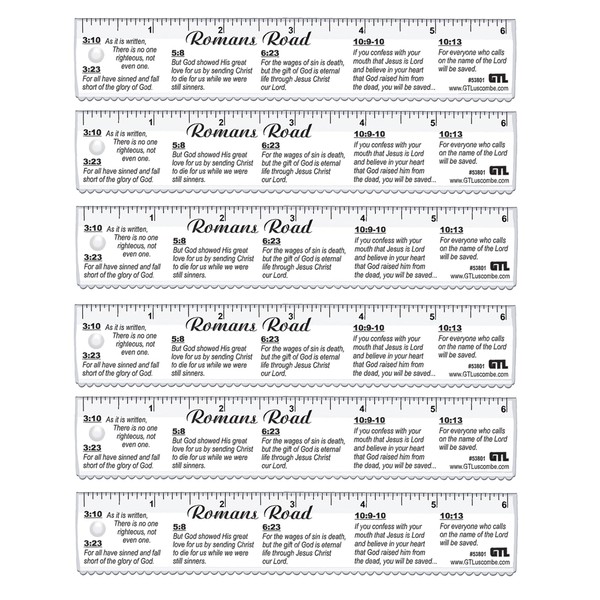G.T. Luscombe, Romans Road Bible Verses, 6 Inch, Clear Ruler with Dual Straight and Scalloped Edge, for Underlining and Journaling, Multitool or Bookmark, Pack of 6