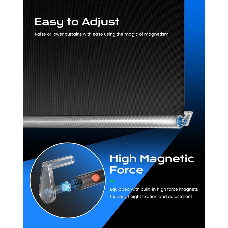 Roll up the blackout curtain, place magnetic fixtures on both ends of the rod, the strong magnetic suction will hold the shades at your desired height.