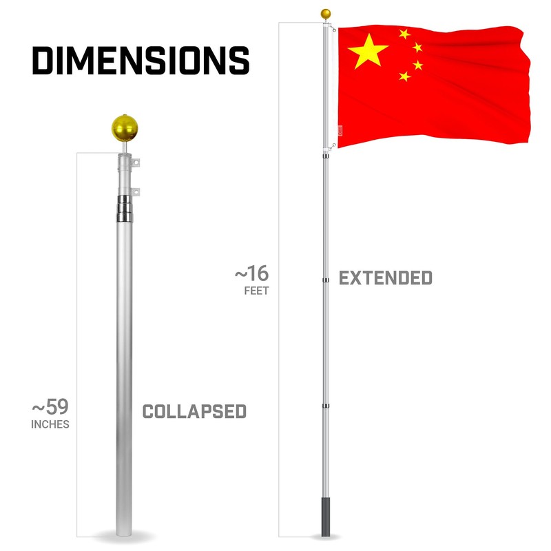 G128 Combo Pack: 16 Ft Telescoping Aluminum Flagpole (Silver) & China Chinese Flag 3x5 Ft, ToughWeave Series Embroidered 300D Polyester | Pole with Flag Included