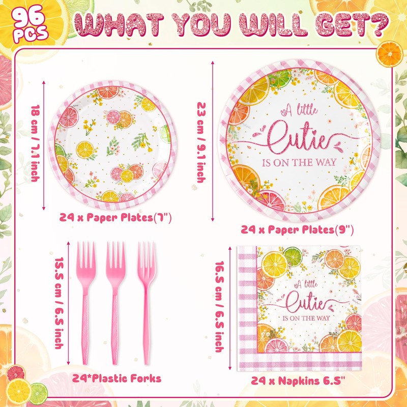 - LITTLE CUTIE PARTY SET: The little cutie baby shower party tableware set are designed with orange tangerine pattern and “A Little Cutie is On The Way” words. Add a touch of whimsy and charm to your party.