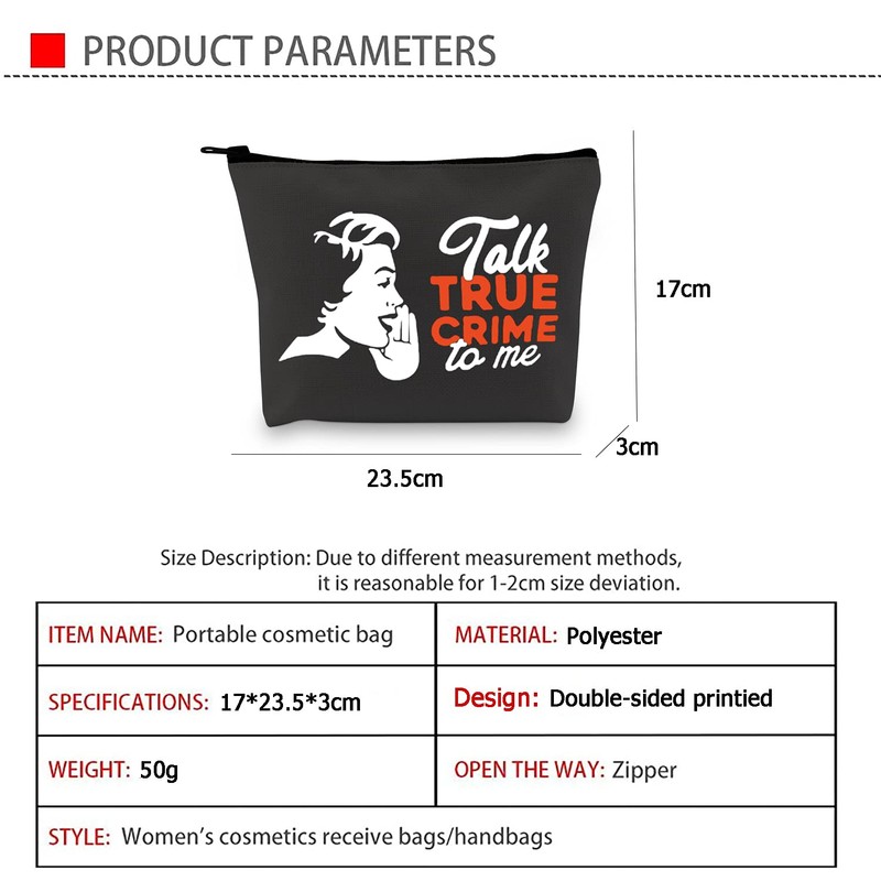 - Tamaño del embrague impermeable para amantes del crimen: 23 x 17 cm, el tamaño perfecto para viajes, viajes nocturnos, o para almacenar tus cosméticos, joyas, accesorios para el cabello, bolígrafos y lápices u otros accesorios. También es ideal para bolsas de pañales.