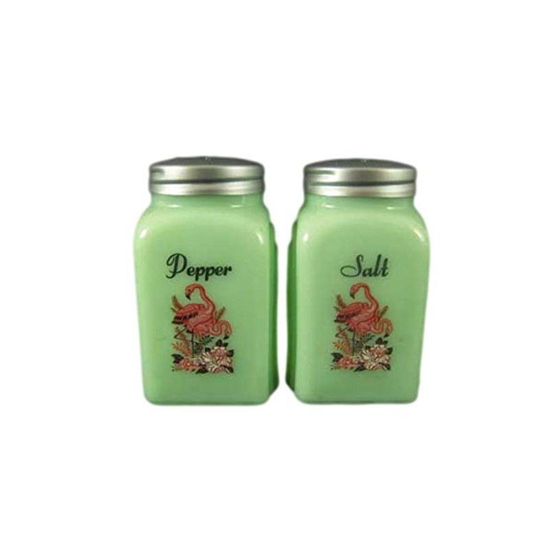 G3291JPF Jadeite Green Glass Pink Flamingo Roman Arch Jadite Salt & Pepper Shakers