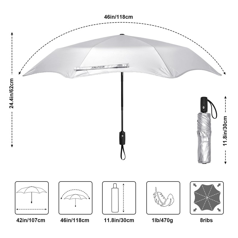 - 【Compact Travel Size】 This UV travel umbrella is 46 inches in arc canopy, 42 inches in diameter, weight 1 lb. It can be folded up to 11.8 inches for easy storage in briefcases, backpacks, luggage, and more. The wrist loop is portable to take and it comes with an umbrella sleeve to store.