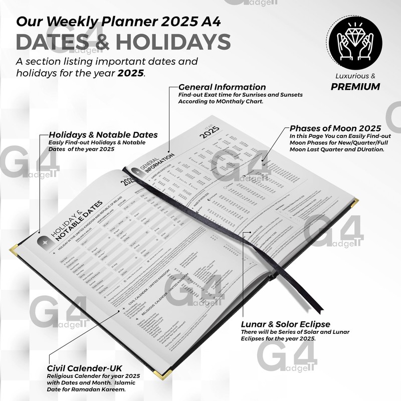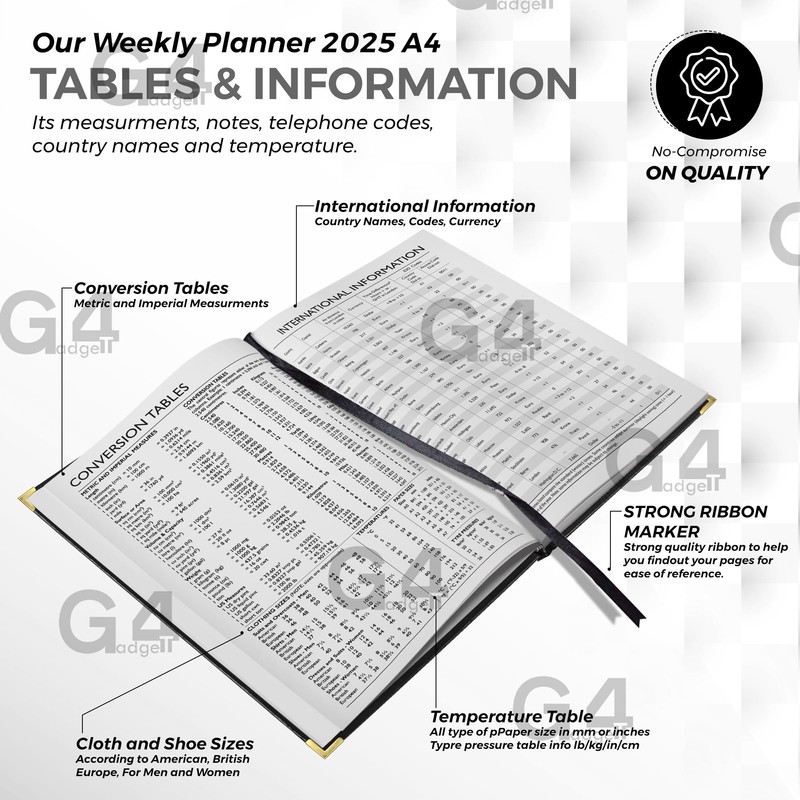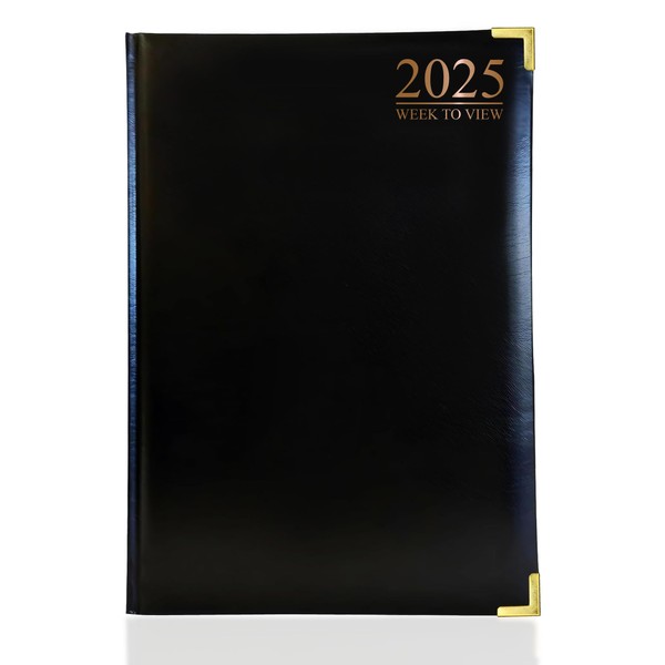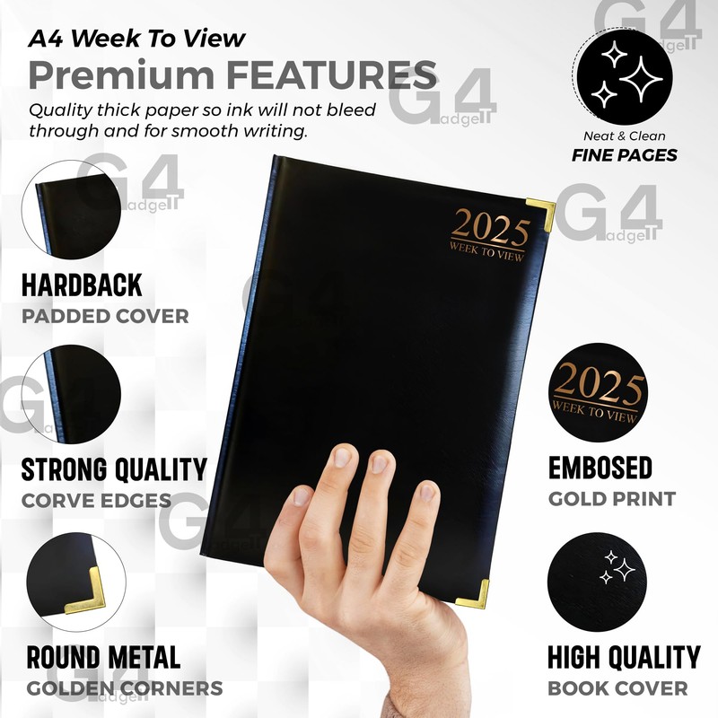 G4GADGET A4 Week To View Diary Black 2025 | Hardback Cover | Weekly Planner with Note Sections | Professional and Durable