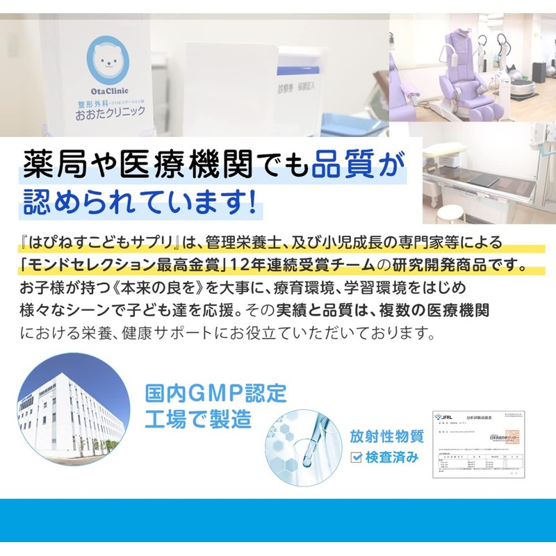 - 管理栄養士、小児成長の専門家による研究開発商品(栄養機能食品)。国内GMP認証工場にて製造。