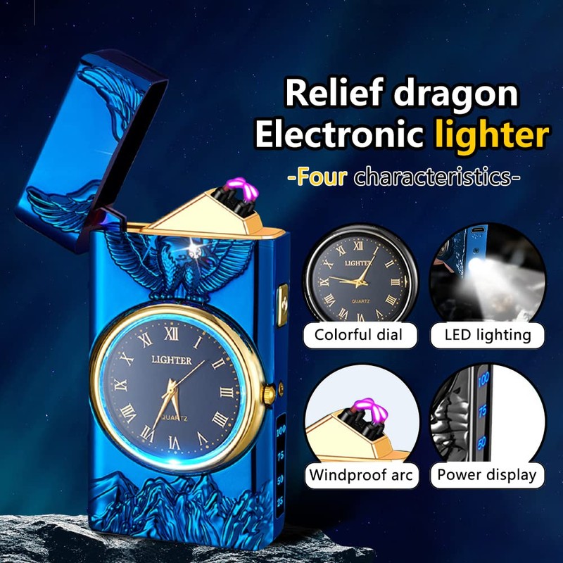 - 【Exquisite Design】:The appearance of this lighter is engraved with exquisite relief, dazzling clock, led lighting, blue cat's eye stone, noble and luxurious appearance is more eye-catching, bottom lighting, no fear of darkness.