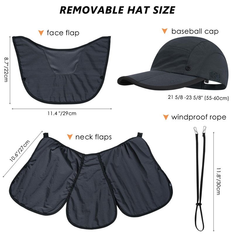 Package includes: folding brim fishing hat, quick dry baseball cap, breathable neck flap and ventilated face cover,adjustable windproof strap, durable button