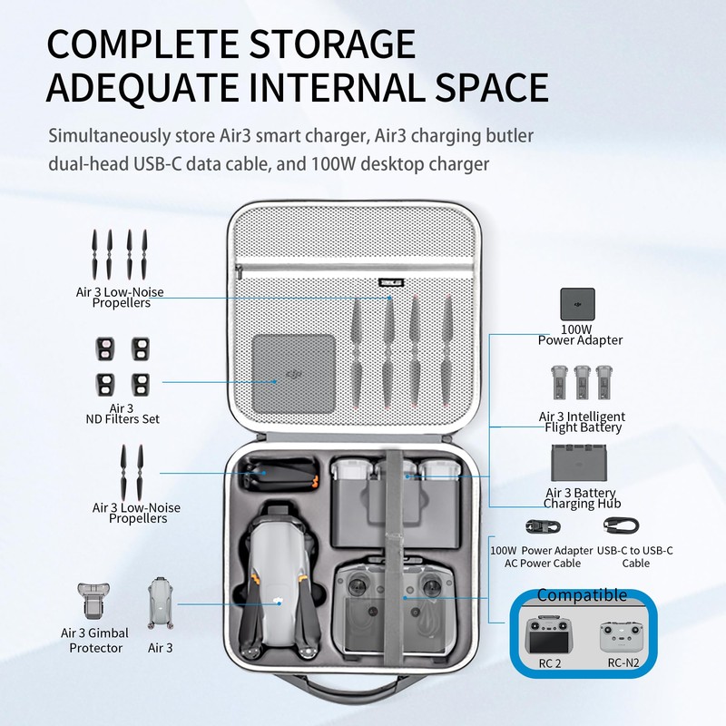 • 【Fits Flymore Combo】 Our Air 3 Carryings Case can accommodate for DJI Air 3 Drone, 1* Air 3 Gimbal Protector, 1*Battery Charging Hub, 4* Extra Air 3 Intelligent Flight Battery, 1* 100W Power Adapter, 4*Air 3 Low-Noise Propellers, 2* Type-C Cables and other Accessories.
