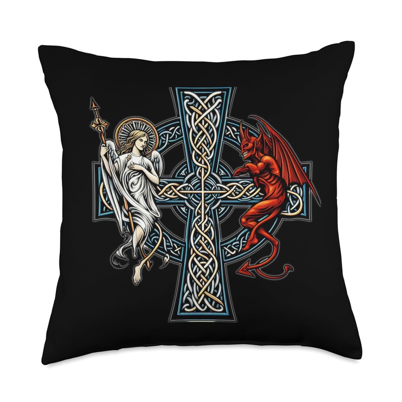 Gaelic Religious Design Celtic Cross Good Evil Angel Devil Irish Throw Pillow, 18x18, Multicolor