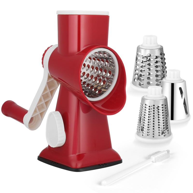 - 3-in-1 drum vegetable grater: This stainless steel rotary chopper is a versatile set with three functions: a blade for cutting, one for grating and one for grinding. No blade assembly required. It cuts cucumbers, zucchini, potatoes, carrots, peanuts, nuts, biscuits, cheese, nuts, chocolate and much more. An essential tool for the kitchen.