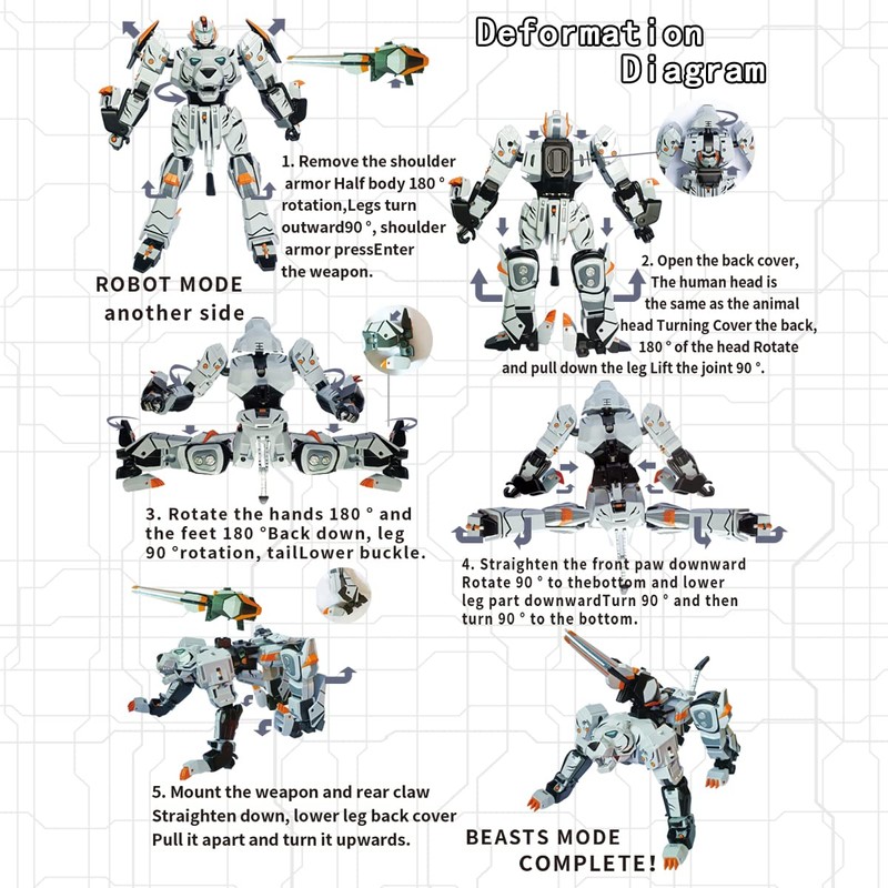 - Specially designed - highly restore animal model, removable shoulder armor, deformable weapon. Realize the deformation between “White Tiger” and warrior robot.