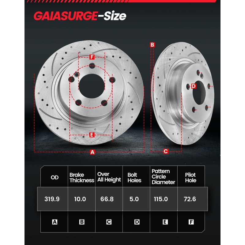 - 【Keep Stability & Durability】Elevate driving with GAIASURGE brake pads and rotors kit, crafted from high-carbon alloy for unparalleled stability. Engineered with precision and boasting a flatness tolerance as low as 0.05mm, GAIASURGE rotors ensure consistent performance, eliminating hardness issues. Resisting cracking and deformation, they offer longevity and optimal performance.